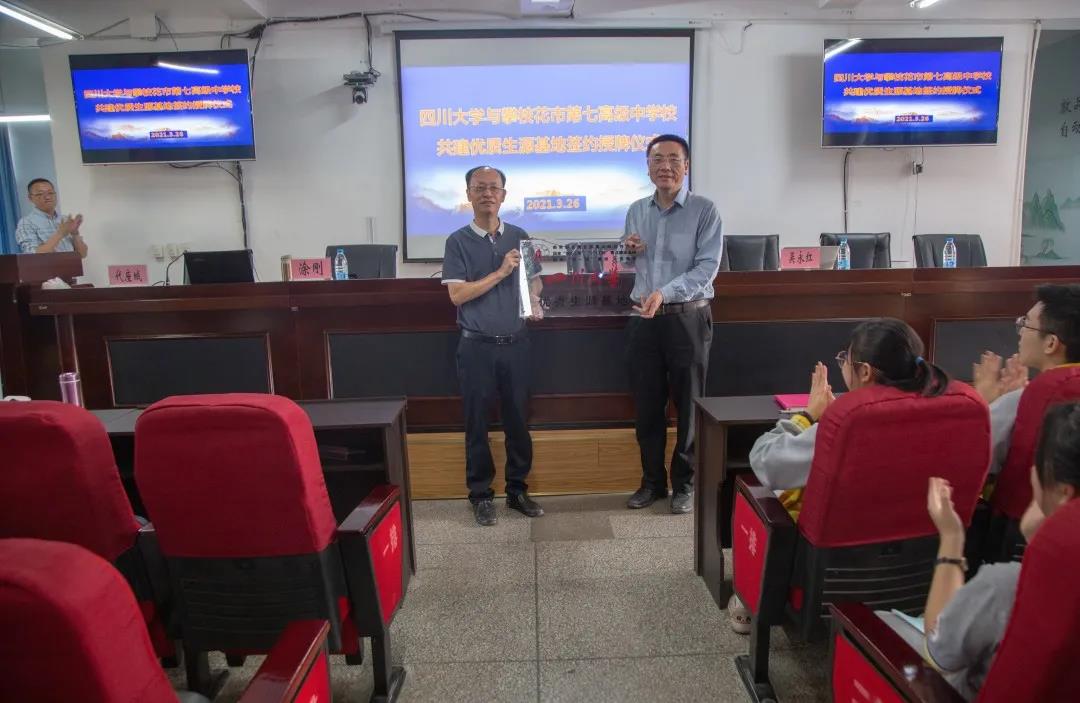 蒋永穆代表四川大学向攀枝花七中颁发了“四川大学优秀生源基地”的牌匾,杨鸿代表攀枝花七中从蒋永穆手中接过了牌匾。现场响起了热烈的掌声。