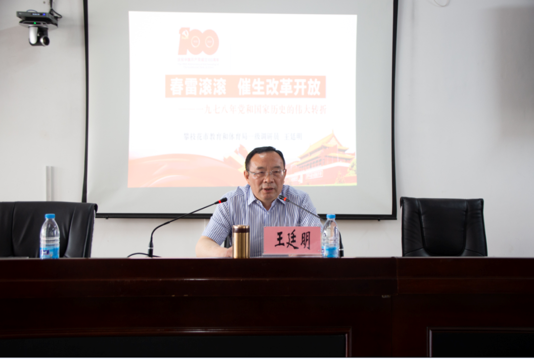 为进一步贯彻落实习近平总书记关于开展党史学习教育的重要讲话精神和党中央、省委、市委及市委教育工委的决策部署,通过学习党史,把党的成功经验传承好、发扬好,不断增强“四个意识”、坚定“四个自信”、做到“两个维护”,4月15日下午,攀枝花市教育和体育局一级调研员、中共攀枝花市委党史学习教育宣讲团成员王廷明为我校全体党员带来了《春雷滚滚催生改革开放》专题讲座。讲座会场设在西城校区博通楼二楼会议室,西城校区的党员同志现场聆听了讲座,花城校区的党员同志通过视频直播观看讲座,会议由市七中党委副书记、纪委书记阎东主持。