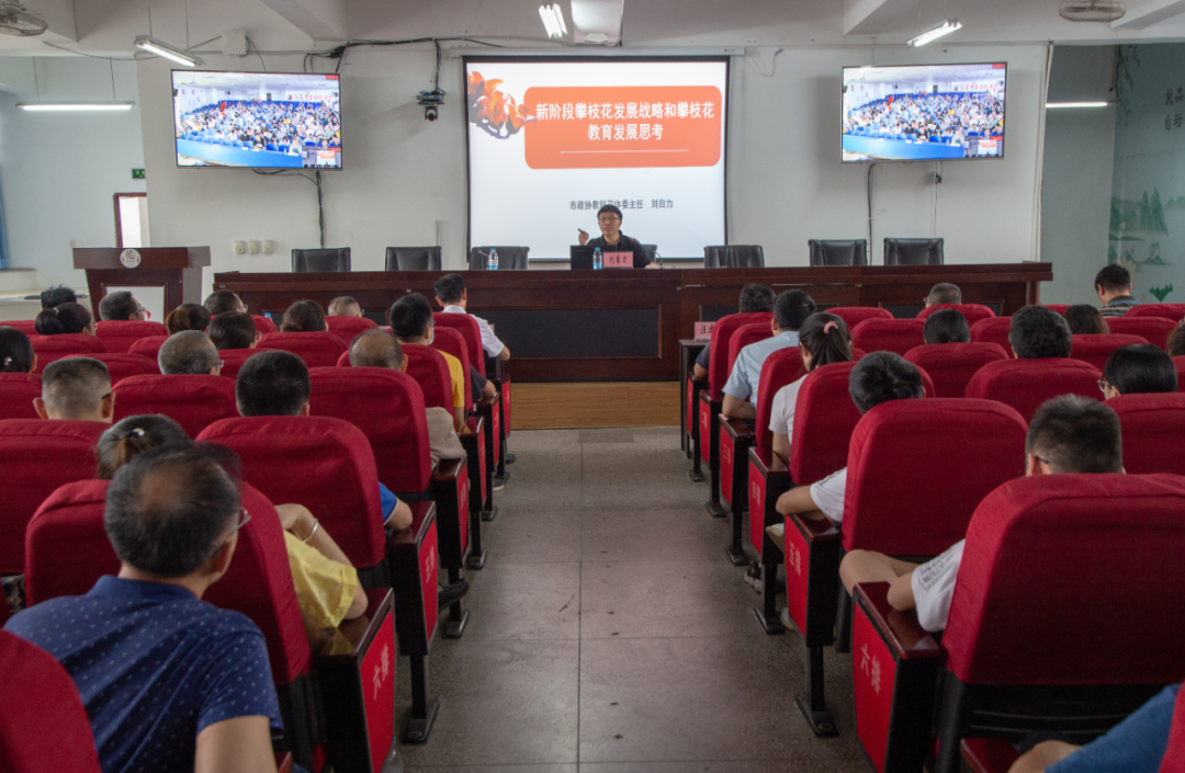 刘自力同志围绕“从‘三新’到‘三圈’——如何理解新阶段国家和攀枝花发展战略”“攀枝花教育在现代化区域中心城市建设中如何作为”两个方面,从国家、四川省和攀枝花市三个层面,运用大量详实的数据和案例,向全体教职工作了一场精彩的报告。