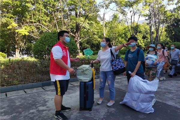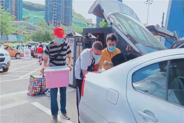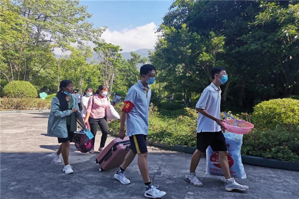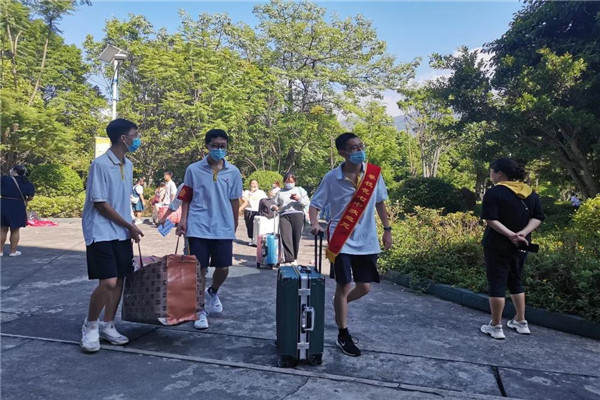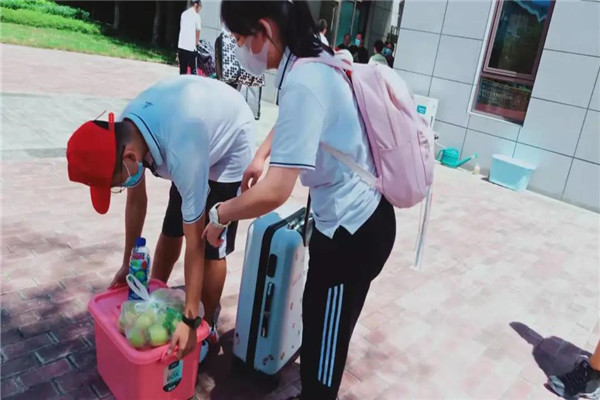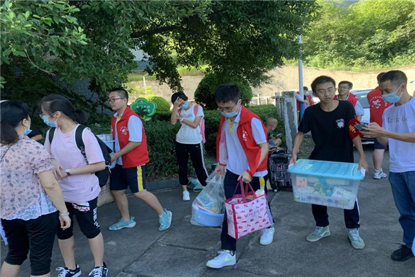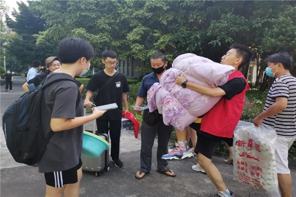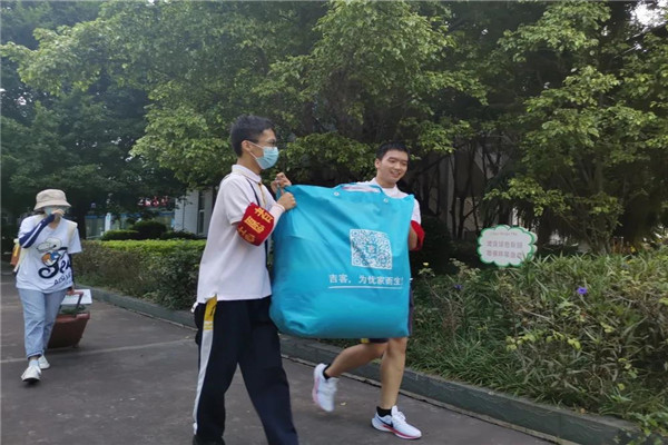 初中部的教师志愿者们组成了“志愿摆渡车队”,一趟趟往返于校门和学生宿舍,帮助学生将沉重的行李搬至学生宿舍楼下。
