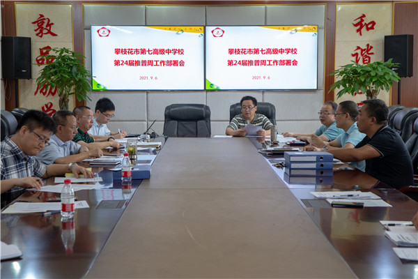 学校召开全校干部会,部署了第24届全国推普周活动的各项工作,制定了《攀枝花市第七高级中学校关于开展第24届全国推广普通话宣传周活动方案》,要求各科室、各教学部根据 “普通话诵百年伟业,规范字写时代新篇”的活动主题,积极开展丰富多彩的推普活动,自觉将语言文字工作融入我校教育教学管理各个环节之中。