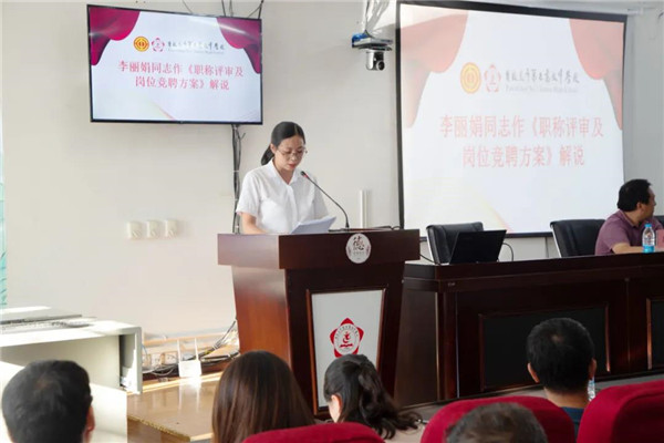 李丽娟同志向大会详细解读了《攀枝花市第七高级中学校职称评审及岗位竞聘量化考核办法》,并提请大会审议。她指出,本次方案是在借鉴其他成功地区的经验的基础上,结合我校实际情况而制定的。她重点解读了职称评审、岗位竞聘的细则,从不同方面详细介绍了量化考核的标准和办法,让参会代表们全面了解了职称评审、岗位竞聘的相关原则。