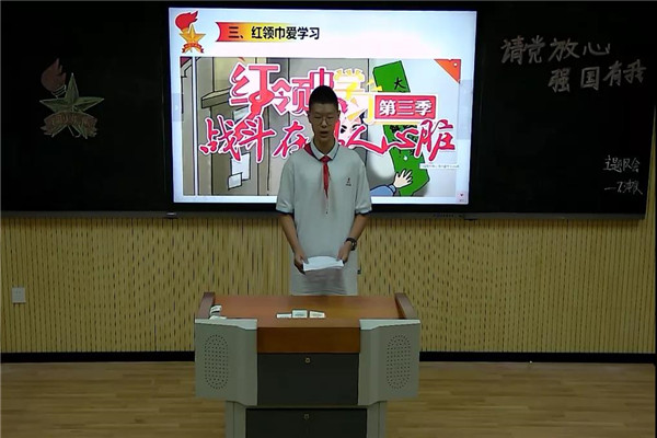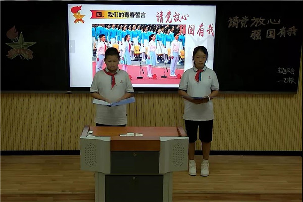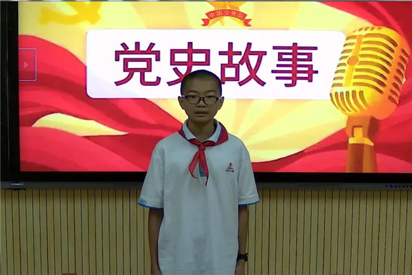 此次主题活动由“重温百年庆典”“党史我来讲”“红领巾爱学习”和“我们的青春誓言”四部分组成。活动中少先队员们一起观看了中国共产党成立100周年庆祝大会上的升旗仪式,并积极分享令人印象最深刻的瞬间和感悟。七三中队的黄浩宇、岳丽和卢婷分别与同学们分享了自己了解的党史故事并发表了自己的“强国宣言”。全体少先队员集体学习了“红领巾爱学习”的网上主题队课,并在何得豪、肖欣然同学的带领下一起高声朗诵《请党放心、强国有我》,嘹亮的宣言彰显了队员们的豪迈热情。