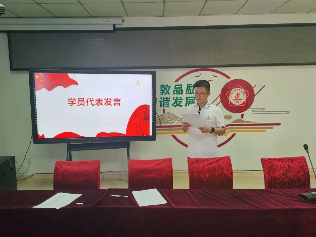 高2023届27班李雨州作为学员代表进行了发言。他代表全体新成员郑重承诺:将以饱满的热情,全身心投入到业余党校的学习中,通过学习,努力提升个人思想政治素质,在思想和行动上积极向党组织靠拢。
