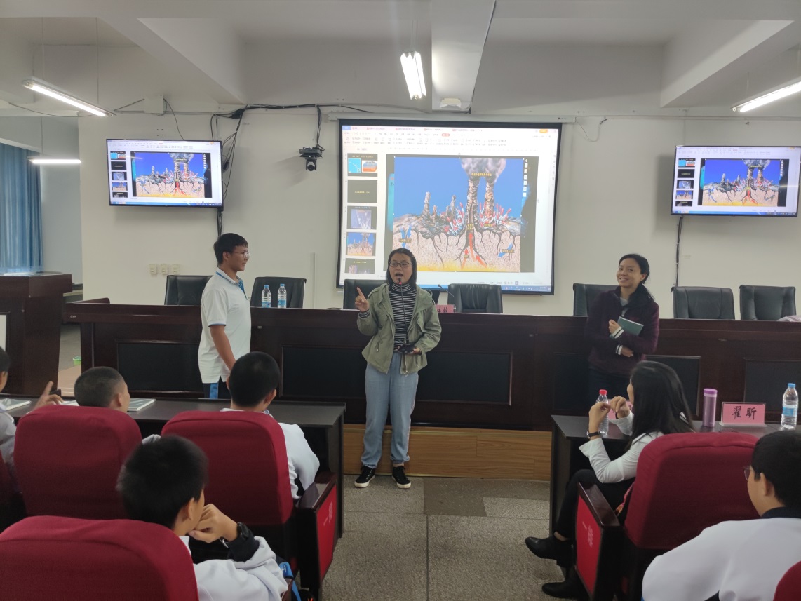 中科院广州分院的杨阳博士以“海底火山:揭秘地球深部的窗口”为题,向同学们科普了海底火山的奥秘。杨博士从地壳钻探、海底火山的喷发、海底地形、地球板块等方面讲述了海底火山的知识,重点讲述了火山给地球带来的丰富矿产资源,以及人类如何在深海开展矿产勘探活动等。杨博士说,研究火山是了解地心最有效的方法,并以“我们的征途是星辰大海”作为结,激励同学们投身海洋矿产勘探事业。
