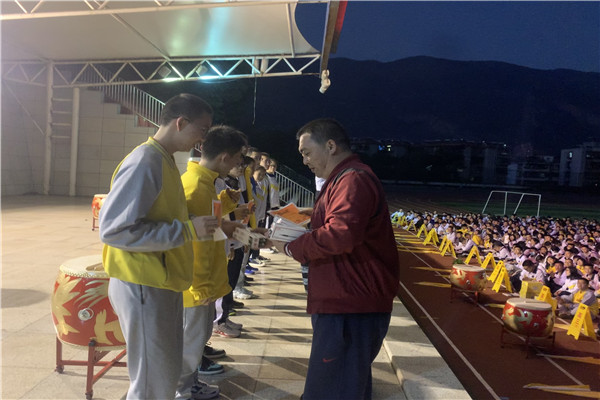 大会在气势磅礴的鼓声中拉开帷幕,由本次全市一统考试中获得全市理科前三名和全市文科前三名的六位同学开鼓,鼓声响彻云霄,振奋人心。首先,牟厚均宣读在全市一统考试中斩获佳绩的优秀个人名单,由年级副主任王锴和杨清松为获奖的同学颁奖。
