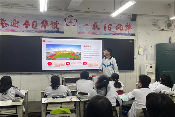 年级部全体班主任精心制作课件,以鲜活的事例,生动的图片,向同学们介绍了学校的过去,描绘了学校的未来,一起感受学校的发展历程和辉煌成果。同时,班主任还为同学们讲解了学校的办学思想、学校精神、校徽校旗和校训师训等校园文化, 让同学们对学校文化有了更深入的感悟。同学们还集体合唱了学校校歌《七彩荣光》,用优美的歌声表达对母校四十华诞的祝福。
