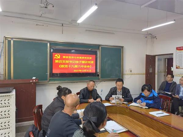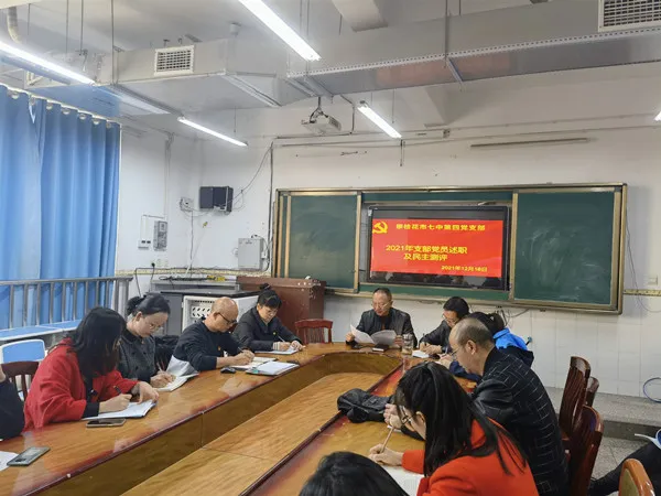 2021年12月16日下午,市七中第四党支部于花城校区初中部二楼会议室召开支部党员大会。会议由第四党支部书记徐子耀主持,全体党员教师参加,学校党委委员、分管副校长谢子明出席本次会议。